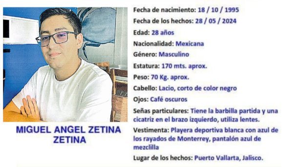 De acuerdo con la ficha de la FGE, Miguel Ángel Zetina desapareció el 28 de mayo en Puerto Vallarta, Jalisco, junto a Jaime Javier Castellanos Zacarías de 30 años, originario de Balancán.