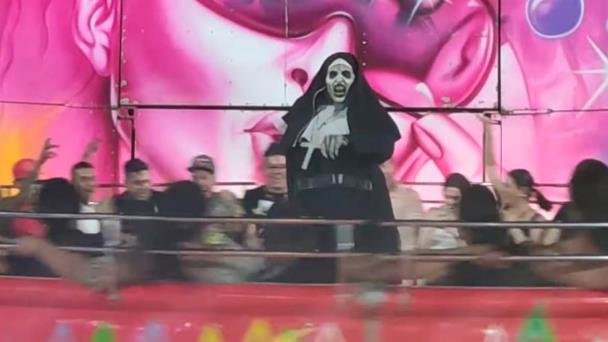 Este hecho no detuvo el ambiente que traían los asistentes en el juego mecánico ni mucho menos a la ‘Monja’, quien en cuestión de segundos se levantó para seguir animando la noche de las personas.