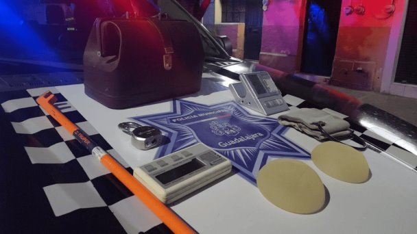 Agentes de la policía de Guadalajara detuvieron a los ladrones en posesión de varios objetos de un consultorio, entre los cuales se encontraban dos implantes de senos.
