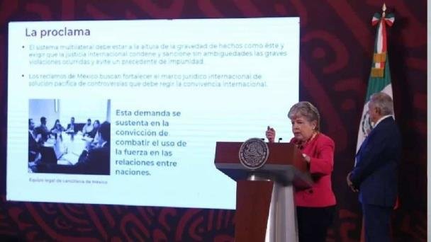 “Hoy se está presentando ante la Corte Internacional de Justicia, ya se está presentando esta demanda hoy, ya hoy se entregó. (Se busca) la suspensión de Ecuador como integrante de la Organización de las Naciones Unidas en tanto no se emita una disculpa pública, reconociendo las violaciones a los principios y normas fundamentales del derecho internacional, con la finalidad de garantizar la reparación del daño moral, infringido al Estado mexicano y a sus nacionales”, explicó la Canciller Alicia Bárcena en conferencia.