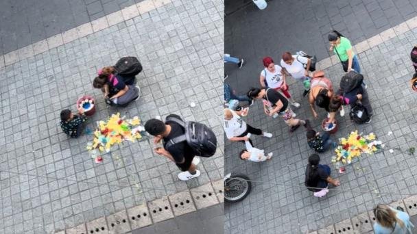 La reacción de las personas a su alrededor fue inmediata y conmovedora. Más de 15 transeúntes, hombres y mujeres, conmovidos por la situación, comenzaron a darle dinero para compensar la pérdida de su mercancía.