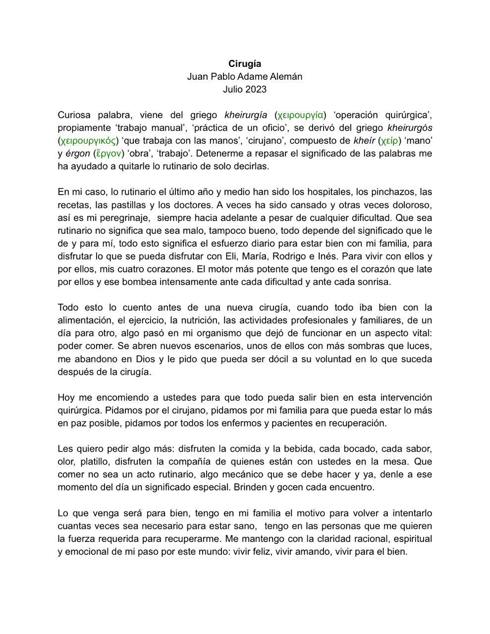 “Hoy me operan. Cuando todo iba bien con la alimentación, el ejercicio, la nutrición, las actividades profesionales y familiares, de un día para otro, algo pasó en mi organismo que dejó de funcionar en un aspecto vital: poder comer”.
